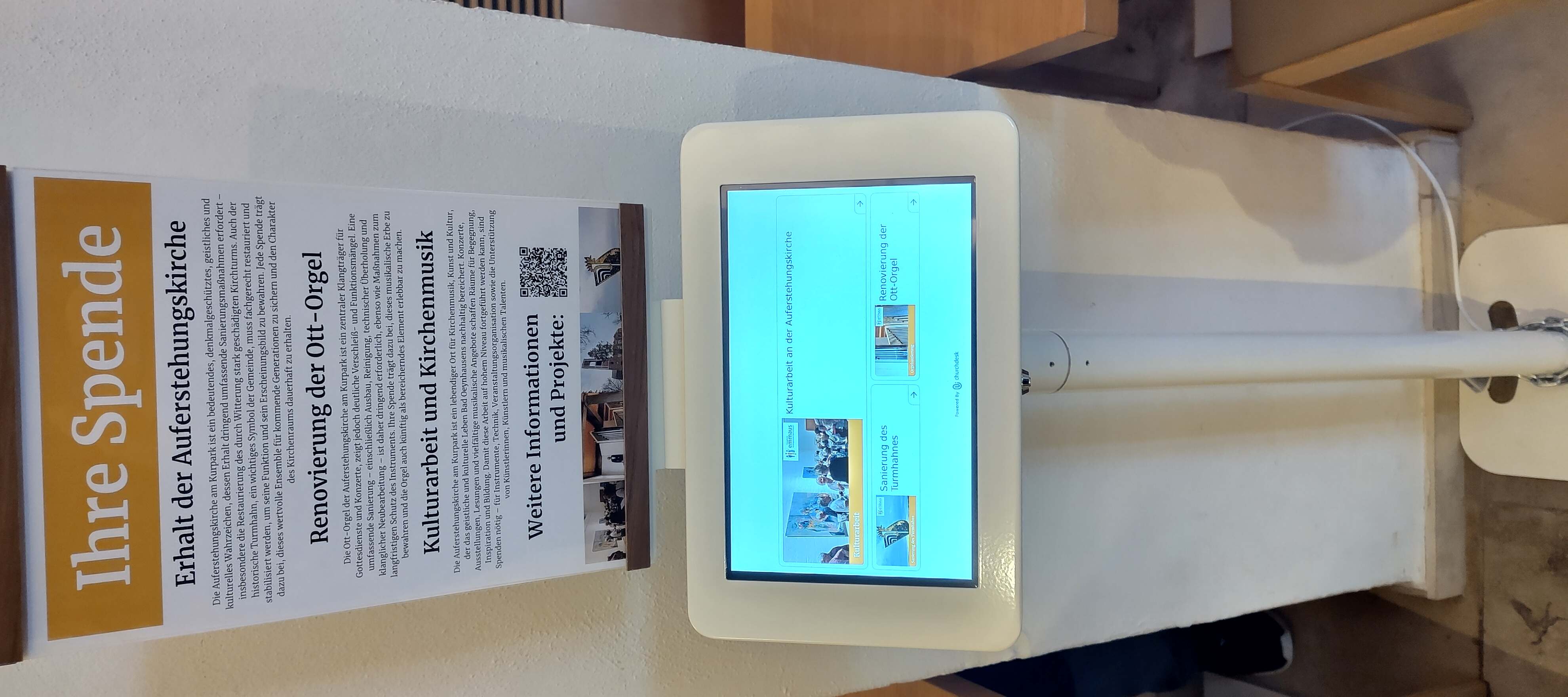 Seit kurz vor Weihnachten gibt es in der Auferstehungskirche am Kurpark eine neue Möglichkeit, unsere Gemeindearbeit zu unterstützen: Eine digitale Spendensäule ermöglicht das einfache und kontaktlose Spenden per EC- oder Kreditkarte sowie per Smartphone.Mit der Spendensäule sammeln wir für verschiedene Projekte unserer Emmaus-Kirchengemeinde. Im Mittelpunkt stehen derzeit die notwendigen Baumaßnahmen an der Auferstehungskirche, darunter die Restaurierung des Turmhahns, die Sanierung von Schäden am Kirchturm sowie die Renovierung der Ott-Orgel. Auch die Musik- und Kulturarbeit sowie die allgemeine Gemeindearbeit können auf diesem Weg unterstützt werden.